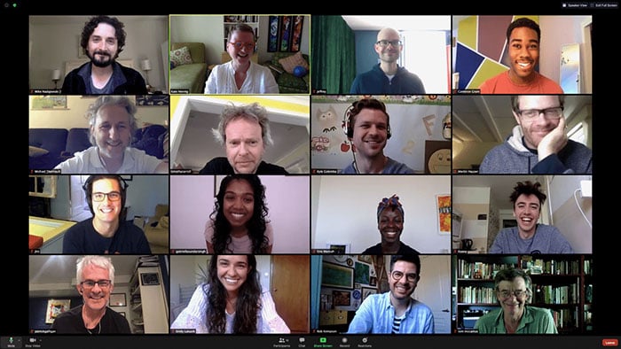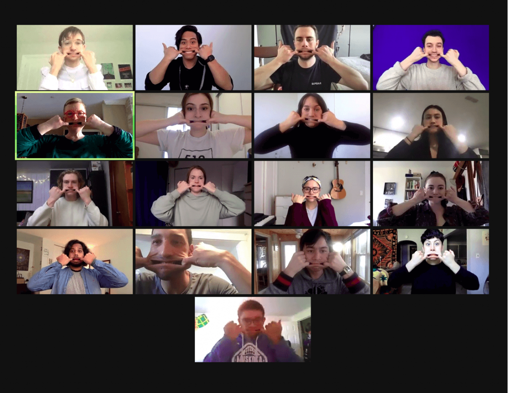 Kate Hennig’s Voice Class. From top left: Owen Boucher, Ray Jacildo, Jack Copland, David Klein, Kate Hennig, Izzy Nagel, Erin Loretta Mackey, Brynn Godenir, James Daly, Anni Ramsay, Iris Rhian, Alison Beckwith, Karthik Kadam, Kaleb Alexander, Travis Seetoo, Elena Reyes, Jawon Mapp